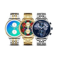 Each timepiece in this bundle tells a story. The serene blues of Mykonos transport you to sun-soaked shores, the intricate geometry of Stained Glass evokes artistic brilliance and spiritual reflection, and Origins offers a powerful homage to ancestral pride, featuring the true scale of Africa on its dial. United by their elegance and powered by reliable Miyota movements, these 41mm watches are crafted with polished stainless steel, sapphire crystal, and unmatched attention to detail.