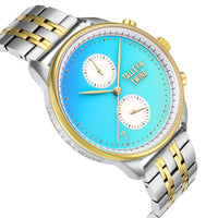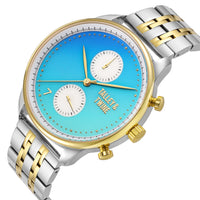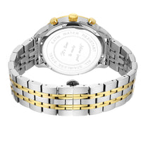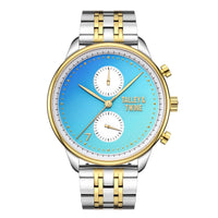 Crafted with precision, the Mykonos features a robust 46mm case forged from two-tone stainless steel in radiant gold and silver. Its scratch-resistant sapphire crystal offers enduring clarity, while the dependable Miyota movement ensures flawless timekeeping. The matching two-tone bracelet blends strength and style, delivering a refined wrist presence.