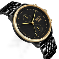 Encased in a bold 46mm two-tone stainless steel case—featuring an opulent black and gold finish—the Pharaoh is a beacon of strength and sophistication. Its sapphire crystal offers unparalleled scratch resistance, while the precise Miyota movement ensures you stay on time and in control. A sleek all-black stainless steel bracelet anchors the piece with modern luxury and enduring strength.